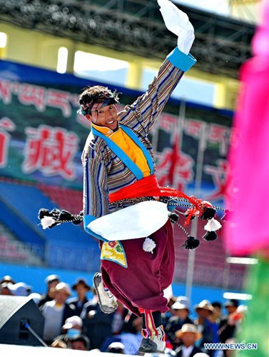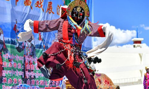 An artist from Lhozhag County performs Tibetan Opera during a cultural festival in Shannan, southwest China's Tibet Autonomous Region, Aug. 17, 2019. A Tibetan Opera exhibition was held during a cultural festival in Shannan from Aug. 17 to 18. Teams from Zha'nang County, Lhozhag County and Cona County presented classic Tibetan Opera to audience. (Xinhua/Zhang Rufeng)