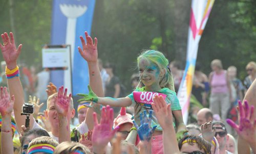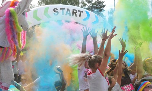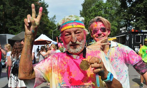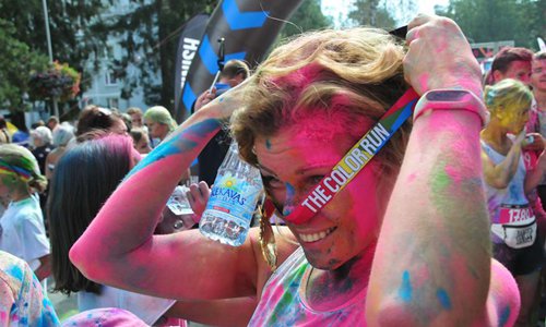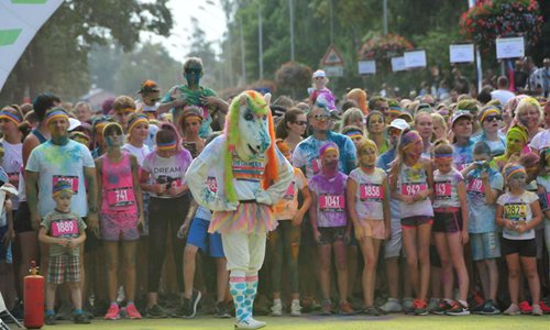 People have fun ahead of the Color Run in Jurmala, Latvia, on Aug. 18, 2019. The 5 km race was held in the Latvian coastal resort town of Jurmala on Sunday. (Photo by Janis/Xinhua)