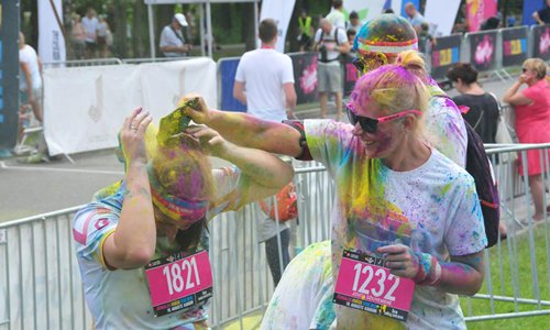 Participants celebrate after reaching the finish line during the Color Run in Jurmala, Latvia, on Aug. 18, 2019. The 5 km race was held in the Latvian coastal resort town of Jurmala on Sunday. (Photo by Janis/Xinhua)