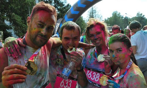 A woman wears a medal after reaching the finish line during the Color Run in Jurmala, Latvia, on Aug. 18, 2019. The 5 km race was held in the Latvian coastal resort town of Jurmala on Sunday. (Photo by Janis/Xinhua)