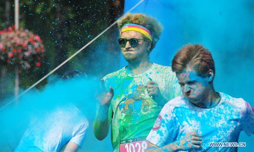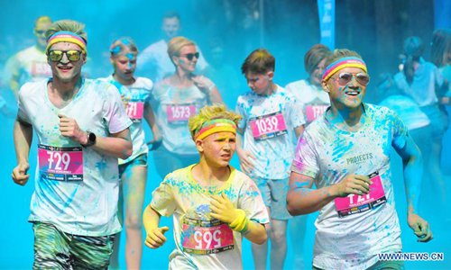 People participate in the Color Run in Jurmala, Latvia, on Aug. 18, 2019. The 5 km race was held in the Latvian coastal resort town of Jurmala on Sunday. (Photo by Janis/Xinhua)