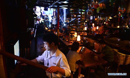 A waiter checks customer orders at a night pub in Jiangbei District of southwest China's Chongqing Municipality, Aug. 16, 2019. More vigor has been poured into Chongqing's evening economy as local authorities improve zoning of night markets, scale up investment on night market branding and facilities, while encouraging consumer spending with night-time leisure activities. (Xinhua/Yin Dongxun)