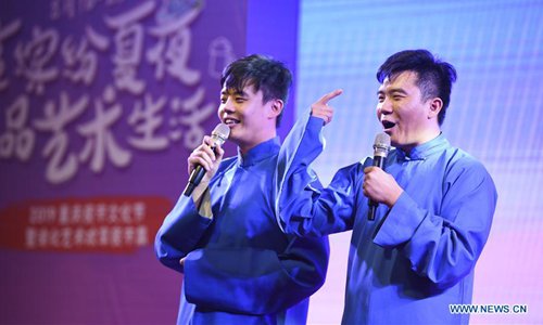 Actors perform traditional Xiangsheng talkshow at a night market in Yubei District of southwest China's Chongqing Municipality, Aug. 16, 2019. More vigor has been poured into Chongqing's evening economy as local authorities improve zoning of night markets, scale up investment on night market branding and facilities, while encouraging consumer spending with night-time leisure activities. (Xinhua/Wang Quanchao)