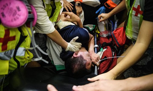 Paramedics take away GT reporter Fu Guohao after he was beaten by rioters in the Hong Kong International Airport on Wednesday. Photo: AFP