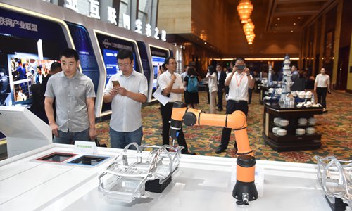 Visitors are taking photos of a mechanical arm showcased at the 2019 International Industrial Internet Conference and Exhibition in East China's Qingdao on Thursday. Experts and entrepreneurs in industries of internet and manufacturing from six countries and regions, as well as more than 20 domestic regions have been attracted to the event. Photo: IC