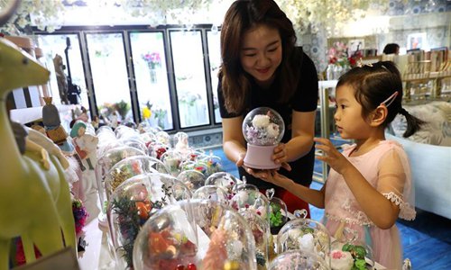 A staff introduces the preserved flowers at a flower shop in Shijiazhuang, north China's Hebei Province, Aug. 19, 2019. Li Hong has been selling fresh flowers over 10 years and started preserved flowers business since 2018. She introduces elements of Chinese traditional handicrafts into her products to make them more attractive. (Xinhua/Zhao Danhui)