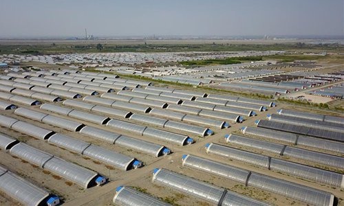 Aerial photo taken on Aug. 18, 2019 shows greenhouses put in use at an eco industrial park in Jiuquan City, northwest China's Gansu Province. Bordering the Badain Jaran Desert, the city used to find it difficult to develop economy. In recent years, a program has been kicked off in local region to build greenhouses in the desert, taking advantage of the extended amount of sunlight and water source from the Qilian Mountains. Up to now, more than 1,666 hectares of greenhouses have been set up in the region. (Xinhua/Fan Peishen)
