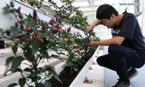 A worker trims saplings at an eco industrial park in Jiuquan City, northwest China's Gansu Province, Aug. 18, 2019. Bordering the Badain Jaran Desert, the city used to find it difficult to develop economy. In recent years, a program has been kicked off in local region to build greenhouses in the desert, taking advantage of the extended amount of sunlight and water source from the Qilian Mountains. Up to now, more than 1,666 hectares of greenhouses have been set up in the region. (Xinhua/Fan Peishen)