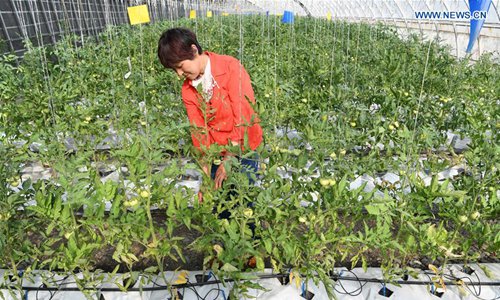 A farmer works in a greenhouse at an eco industrial park in Jiuquan City, northwest China's Gansu Province, Aug. 18, 2019. Bordering the Badain Jaran Desert, the city used to find it difficult to develop economy. In recent years, a program has been kicked off in local region to build greenhouses in the desert, taking advantage of the extended amount of sunlight and water source from the Qilian Mountains. Up to now, more than 1,666 hectares of greenhouses have been set up in the region. (Xinhua/Fan Peishen)