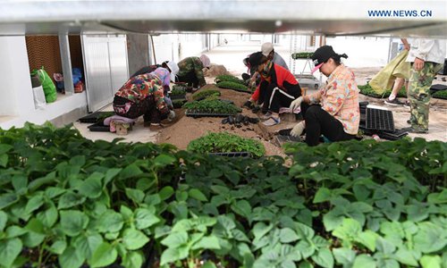 Farmers arrange plants at an eco industrial park in Jiuquan City, northwest China's Gansu Province, Aug. 18, 2019. Bordering the Badain Jaran Desert, the city used to find it difficult to develop economy. In recent years, a program has been kicked off in local region to build greenhouses in the desert, taking advantage of the extended amount of sunlight and water source from the Qilian Mountains. Up to now, more than 1,666 hectares of greenhouses have been set up in the region. (Xinhua/Fan Peishen)