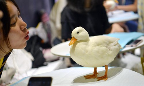 Consumers interact with pet ducks at a café in Chengdu, capital of Southwest China's Sichuan Province on Monday. The coffee shop, set up by college graduates, has raised several ducks as pets to attract customers. Photo: VCG