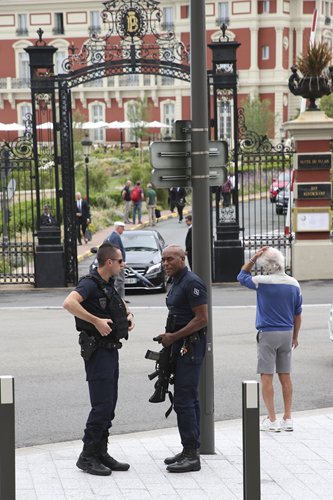 Armed police officers on Tuesday patrol outside the Hotel du Palais, a venue for the upcoming Group of Seven (G7) summit in Biarritz, southwestern France. French police are setting up checkpoints and combing Atlantic beaches to secure the southwestern coast for world leaders coming for the G7 summit. Photo: AP