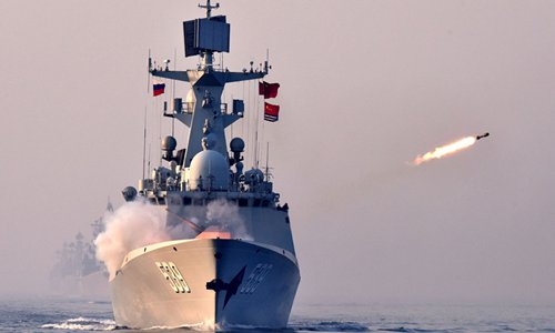 Photo taken on May 3, 2019 shows a missile frigate of the Chinese People's Liberation Army (PLA) Navy firing a depth charge rocket during a China-Russia joint naval drill. (Xinhua/Li Ziheng)