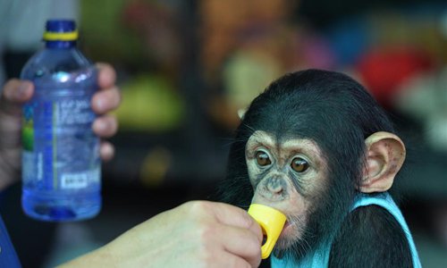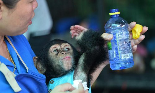 A woman feeds a chimpanzee with water at Samut Prakarn Crocodile Farm and Zoo in Samut Prakarn province, Thailand, Aug. 18, 2019. (Xinhua/Rachen Sageamsak)