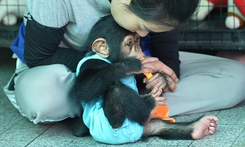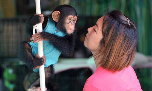 A woman plays with a chimpanzee at Samut Prakarn Crocodile Farm and Zoo in Samut Prakarn province, Thailand, Aug. 18, 2019. (Xinhua/Rachen Sageamsak)