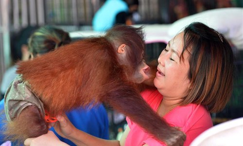 A woman plays with an orangutan at Samut Prakarn Crocodile Farm and Zoo in Samut Prakarn province, Thailand, Aug. 18, 2019. (Xinhua/Rachen Sageamsak)