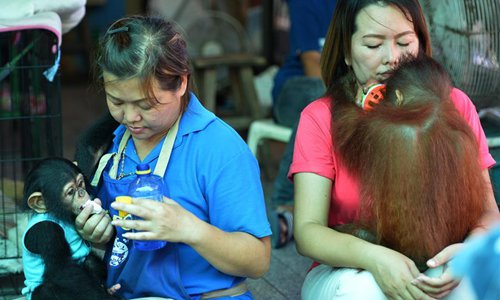 Tourists feed a chimpanzee and an orangutan at Samut Prakarn Crocodile Farm and Zoo in Samut Prakarn province, Thailand, Aug. 18, 2019. (Xinhua/Rachen Sageamsak)