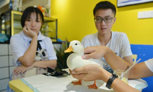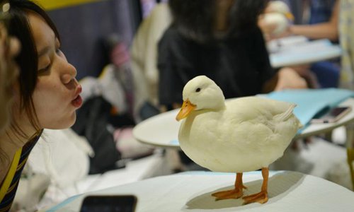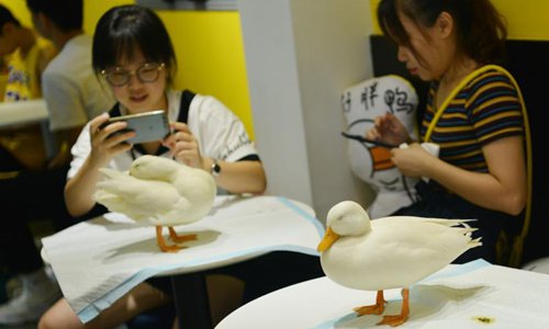 Call ducks, a type of domesticated duck raised primarily as pets, are seen at a coffee shop in Chengdu City, Sichuan Province, Aug. 19, 2019. The café, which opened this year, is the brainchild of several recent graduates, who introduced the Call ducks, imported from the Netherlands and with a price tag of approximately 10,000 yuan ($1,420), to attract young customers to their business. (Photo: China News Service/Zhang Lang)