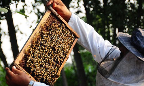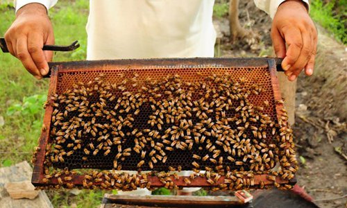 A farmer collects honey at a bee farm in northwest Pakistan's Peshawar on Aug. 20, 2019. (Photo by Saeed Ahmad/Xinhua)