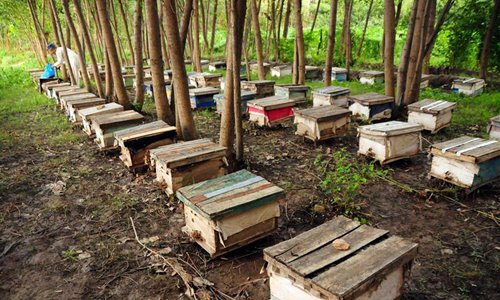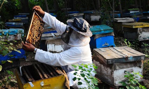 A farmer works at a bee farm in northwest Pakistan's Peshawar on Aug. 20, 2019. (Photo by Saeed Ahmad/Xinhua)