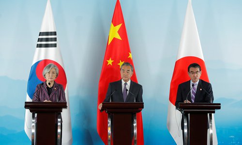 Chinese State Councilor and Foreign Minister Wang Yi (center), South Korean Foreign Minister Kang Kyung-wha (left) and Japanese Foreign Minister Taro Kono attend a press conference after the ninth Trilateral Foreign Ministers' Meeting among China, South Korea and Japan in Beijing on Wednesday. Photo: VCG