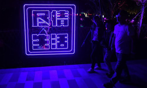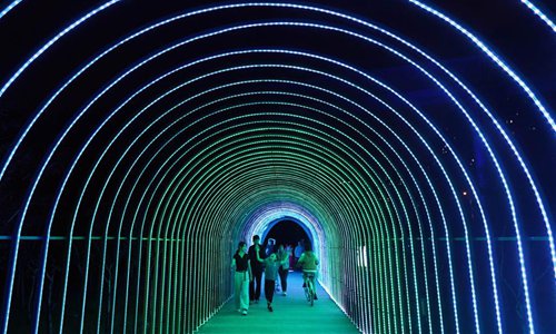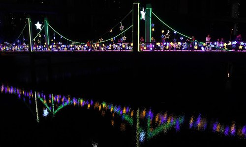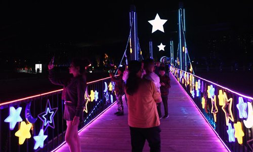 Citizens view the light show along the Yitong River in Changchun City, northeast China's Jilin Province, Aug. 21, 2019. (Xinhua/Lin Hong)