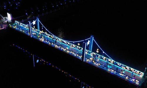 Aerial photo taken on Aug. 21, 2019 shows the illuminated Yongding Bridge over the Yitong River in Changchun City, northeast China's Jilin Province. (Xinhua/Lin Hong)