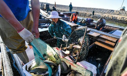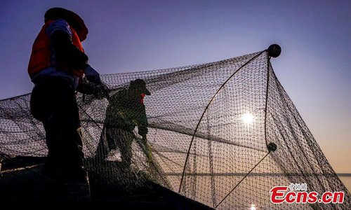 Fisherman Zhou Youli and daughter work on their boat at Ulungur Lake in Fuhai County, Northwest China’s Xinjiang Uygur Autonomous Region, Aug. 7, 2019. Located in the northern part of the Junggar Basin, Ulungur Lake covers 100,000 hectares, making it one of the top ten freshwater lakes in China. A key fishery base in Xinjiang, the lake is rich in more than 20 kinds of wild and precious fish species. The lake has been enforcing a fishing ban each year for 15 years in a row, extending the fishing moratorium to four months from April 1 to July 31 starting two years ago. Local authorities also release millions of fish fry into the lake each year to improve the stock and sustainable development. (Photo: China News Service/Liu Xin)
