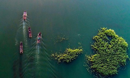 Fishing boats on Ulungur Lake in Fuhai County, Northwest China’s Xinjiang Uygur Autonomous Region, Aug. 8, 2019. Located in the northern part of the Junggar Basin, Ulungur Lake covers 100,000 hectares, making it one of the top ten freshwater lakes in China. A key fishery base in Xinjiang, the lake is rich in more than 20 kinds of wild and precious fish species. The lake has been enforcing a fishing ban each year for 15 years in a row, extending the fishing moratorium to four months from April 1 to July 31 starting two years ago. Local authorities also release millions of fish fry into the lake each year to improve the stock and sustainable development. (Photo: China News Service/Liu Xin)