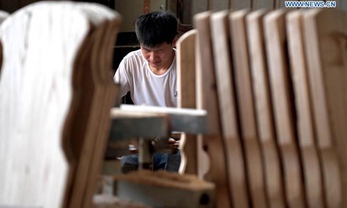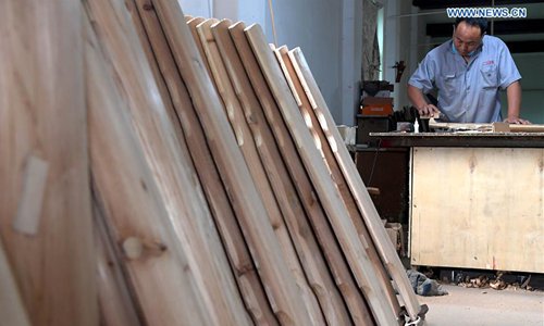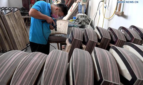 A craftsman makes Guqin, a seven-string traditional Chinese instrument, at a workshop in Xuchang Village, Lankao County of central China's Henan Province, Aug. 21, 2019. The village of Xuyang makes full use of its paulownia wood resources and vigorously develops musical instrument production. A total of 82 workshops producing over 20 kinds of musical instruments have so far emerged in the village and the annual output has reached 100 thousand. Photo:Xinhua