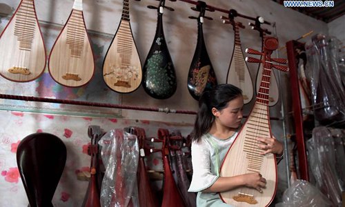 A woman tunes up a Pipa, a traditional Chinese musical instrument, at a workshop in Xuchang Village, Lankao County of central China's Henan Province, Aug. 21, 2019. The village of Xuyang makes full use of its paulownia wood resources and vigorously develops musical instrument production. A total of 82 workshops producing over 20 kinds of musical instruments have so far emerged in the village and the annual output has reached 100 thousand. Photo:Xinhua