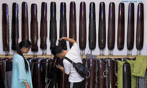 A customer chooses Guqin, a seven-string traditional Chinese instrument, at a workshop in Xuchang Village, Lankao County of central China's Henan Province, Aug. 21, 2019. The village of Xuyang makes full use of its paulownia wood resources and vigorously develops musical instrument production. A total of 82 workshops producing over 20 kinds of musical instruments have so far emerged in the village and the annual output has reached 100 thousand. Photo:Xinhua
