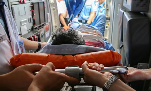 Chinese People's Liberation Army (PLA)'s Peace Train medical team, assisted by the Lao side, helps a Chinese tourist injured in a bus crash in northern Laos to get on the China Eastern Airlines flight MU2574 in Wattay International Airport in Vientiane, Laos, Aug. 22, 2019. The Chinese People's Liberation Army (PLA)'s Peace Train medical team has accompanied four Chinese tourists badly injured in a deadly bus crash in northern Laos to take flights back to China Thursday afternoon. (Photo: Xinhua)