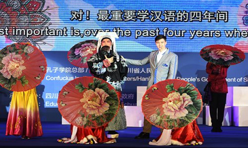 A Chinese Peking Opera artist (left) performs with a foreign student at the opening gala of the 13th Confucius Institute Conference on Tuesday in Chengdu, Southwest China's Sichuan Province. University chancellors and headmasters from 150 countries and regions, together with nearly 1,500 Confucius institute delegates attended the event. Photo: VCG