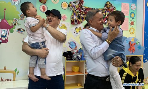 Bahraini Ambassador to China Anwar Alabdulla (2nd L) and Nepalese Ambassador to China Leela Mani Paudyal interact with local children at Guyuanxiang community in Urumqi, capital city of northwest China's Xinjiang Uyghur Autonomous Region, Aug. 19, 2019. Ambassadors and envoys from seven countries visited Xinjiang Uyghur Autonomous Region from Aug. 19 to 21 at the invitation of the regional government. The diplomats from Laos, Cambodia, the Philippines, Nepal, Sri Lanka, Bahrain and Nigeria visited the cities of Urumqi and Turpan, getting to know the region's economic and social development. They positively evaluated the Chinese government's efforts in promoting local economic development and improving people's livelihood, safeguarding citizens' freedom of religious belief, as well as combating and preventing terrorism in accordance with the law, saying that Xinjiang's successful experience is worth learning. (Xinhua/Sun Shaoxiong)
