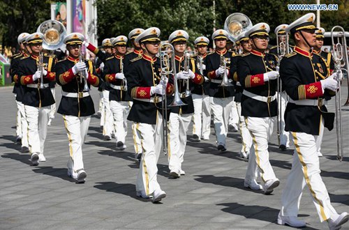 Members of the band of the People's Liberation Army of China take part in the International Military Music Festival parade in Moscow, Russia, Aug. 24, 2019.(Photo: Xinhua)