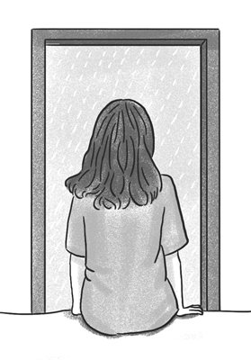 A: Why are you sitting by the door? It's raining. Hurry up and come inside, or else you'll get soaked.