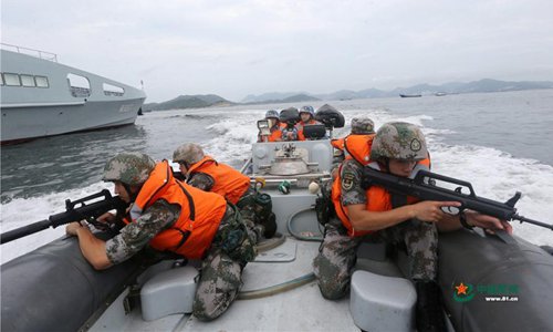 The Hong Kong Garrison of the Chinese People's Liberation Army (PLA) holds a drill in waters near Hong Kong, June 26, 2019. Members of the army, navy and air force of the PLA garrison in Hong Kong took part in the joint naval and air patrol exercise that aimed to review and raise the units' combat abilities in emergency dispatches, ad hoc deployment and joint operations. Photo: 81.cn
