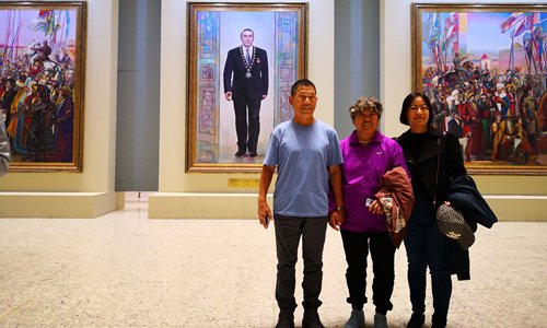 Chinese tourists pose for a photo in front of a portrait of former Kazakhstan President Nursultan Nazarbayev at the National Museum in Nur-Sultan on August 17. Photo: Li Qian/GT