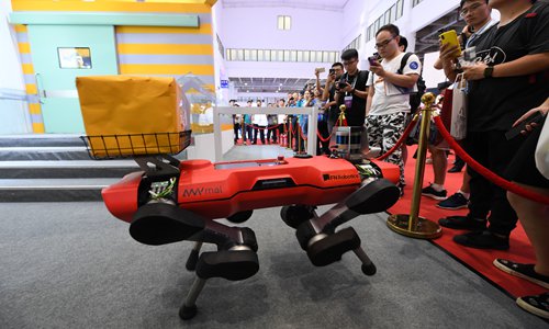 An intelligent robot dog regarded as a rescue worker is displayed at the 2019 Word Robot Conference in Beijing on August 20. Photo: IC