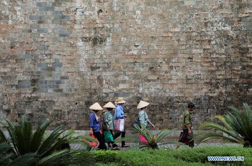 Local people walk near an ancient wall of the Imperial Citadel of Thang Long in Vietnam's capital Hanoi, Aug. 23, 2019. The Imperial Citadel of Thang Long was built in the 11th century. Situated at the heart of Hanoi, the central sector of the Imperial Citadel of Thang Long was inscribed on the World Heritage List by the UNESCO in 2010. (Photo: Xinhua)