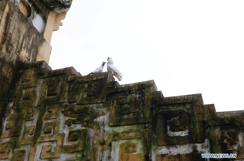 Photo taken on Aug. 21, 2019 shows two pigeons resting on an ancient wall of Thang Long Imperial Citadel in Vietnam's capital Hanoi. The Imperial Citadel of Thang Long was built in the 11th century. Situated at the heart of Hanoi, the central sector of the Imperial Citadel of Thang Long was inscribed on the World Heritage List by the UNESCO in 2010. (Photo: Xinhua)
