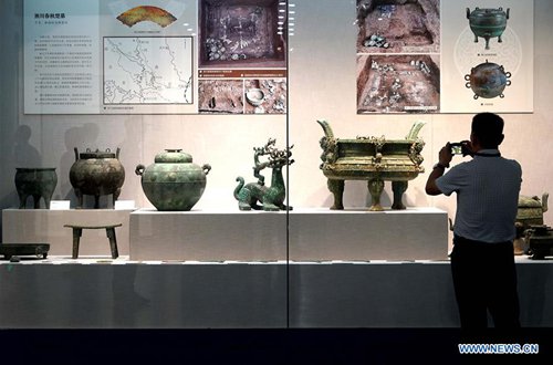 A visitor takes photos of exhibits during an exhibition at Zhengzhou Museum in central China's Henan Province, Aug. 27, 2019. The exhibition on major archaeological discoveries and research achievements in Henan in the past 70 years kicked off here on Tuesday, displaying 1,225 sets of exhibits.(Photo: Xinhua)