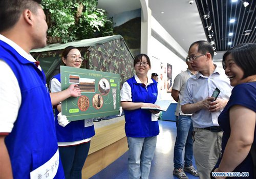 Volunteers explain archaeological knowledge to visitors during an exhibition at Zhengzhou Museum in central China's Henan Province, Aug. 27, 2019. The exhibition on major archaeological discoveries and research achievements in Henan in the past 70 years kicked off here on Tuesday, displaying 1,225 sets of exhibits.(Photo: Xinhua)