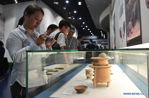 A visitor takes photos of exhibits during an exhibition at Zhengzhou Museum in central China's Henan Province, Aug. 27, 2019. The exhibition on major archaeological discoveries and research achievements in Henan in the past 70 years kicked off here on Tuesday, displaying 1,225 sets of exhibits. (Photo: Xinhua)