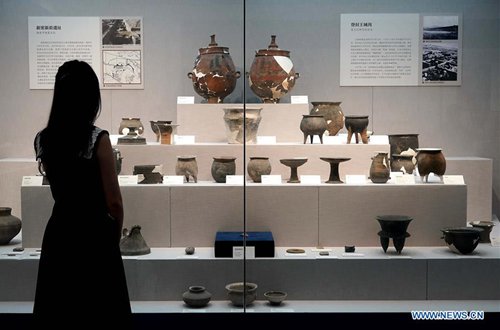 A visitor views exhibits during an exhibition at Zhengzhou Museum in central China's Henan Province, Aug. 27, 2019. The exhibition on major archaeological discoveries and research achievements in Henan in the past 70 years kicked off here on Tuesday, displaying 1,225 sets of exhibits. (Photo: Xinhua)