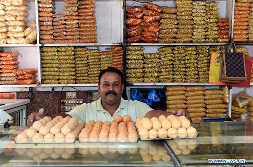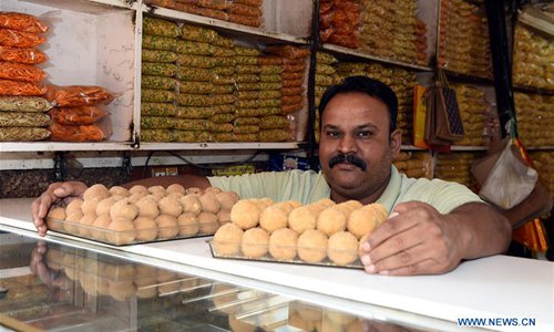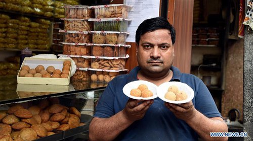 A vendor shows ladoos at a traditional dessert shop in New Delhi, India, Aug. 27, 2019. Ladoo is an Indian sweet typically made of flour, sugar, vegetable oil, spices and nuts. There are many dessert shops selling ladoos across New Delhi. Ladoos are beloved by the locals, either as a tea snack for afternoon breaks or as a dish on festive banquets. (Photo: Xinhua)