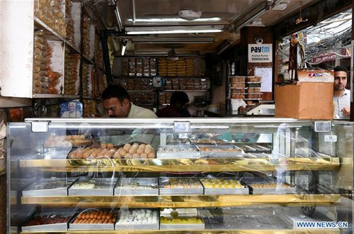 A vendor sells ladoos at a traditional dessert shop in New Delhi, India, Aug. 27, 2019. Ladoo is an Indian sweet typically made of flour, sugar, vegetable oil, spices and nuts. There are many dessert shops selling ladoos across New Delhi. Ladoos are beloved by the locals, either as a tea snack for afternoon breaks or as a dish on festive banquets. (Photo: Xinhua)