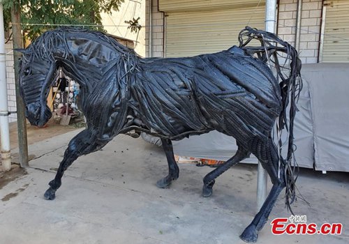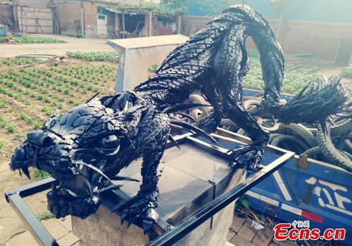 A sculpture made using abandoned tires, created by Zhou Zhenfeng, a researcher specializing in Buddhism at the Hebei Academy of Fine Arts. . A native of Qingyang City in Gansu Province, the 26 year old said he hopes his creation can improve people’s awareness of the need for environmental protection. (Photo: China News Service)