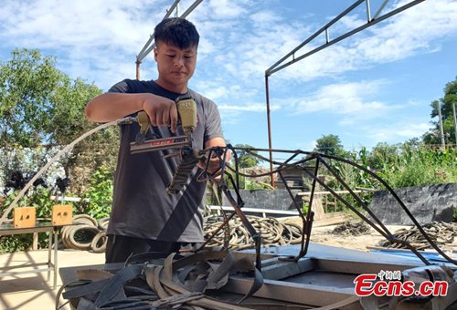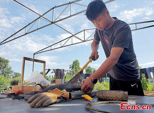 Zhou Zhenfeng, a researcher specializing in Buddhism at the Hebei Academy of Fine Arts, creates a sculpture using abandoned tires and welded steel bars as a frame. A native of Qingyang City in Gansu Province, the 26 year old said he hopes his creation can improve people’s awareness of the need for environmental protection. (Photo: China News Service)